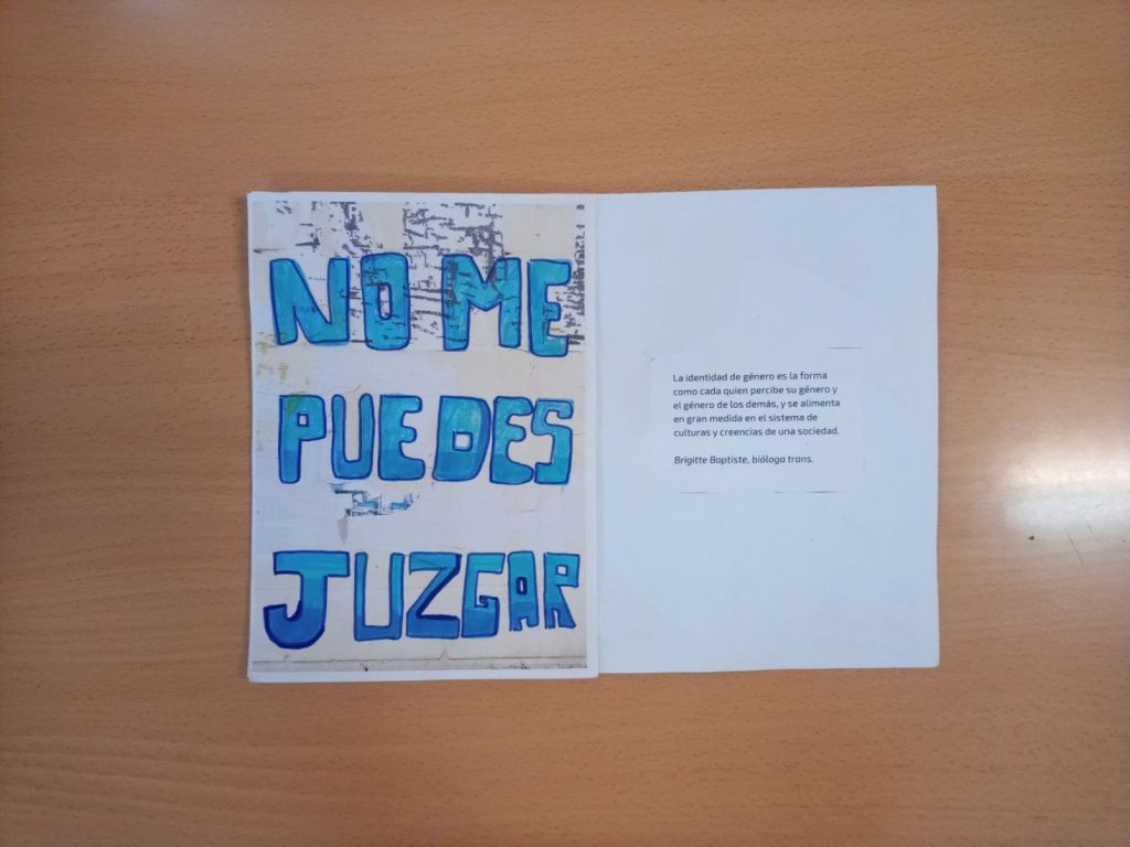 Para la sesión de hoy solo faltaría completar un par de páginas, las que se verían nada más abrir el fanzine. Así que le pedimos al alumnado que pensara en un mensaje que pudiera ir en una pancarta (o que fuese reivindicativo) y una definición para alguno de los conceptos que trabajamos en la primera fase (equidad, orientación sexual e identidad de género).